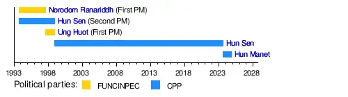 The following is a list of prime ministers of Cambodia after the restoration of the monarchy in 1993.