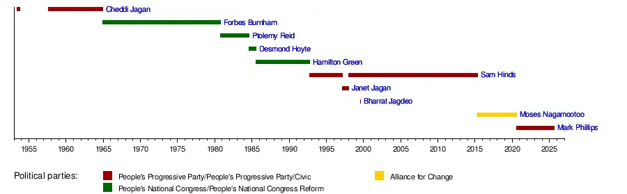 This is a list of the prime ministers of Guyana, from the establishment of the office of Chief Minister of British Guiana in 1953 to the present day. After the creation of the vice presidency in 1980, the title became the Prime Minister and First Vice President of Guyana.