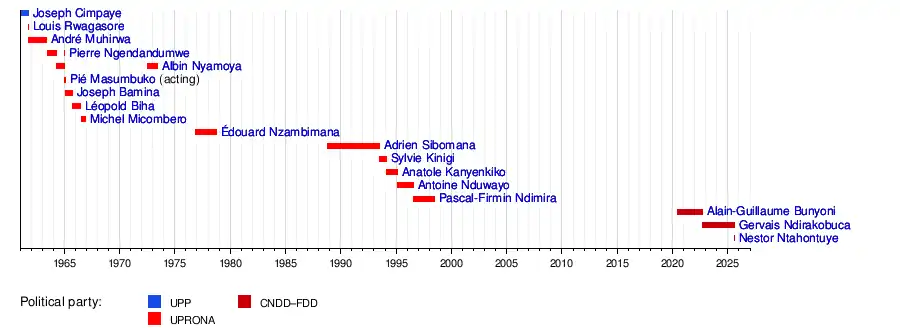Counting both the Kingdom and Republic periods, a total of sixteen people have served in the office (not counting one Acting Prime Minister). Additionally, two people, Pierre Ngendandumwe and Albin Nyamoya, served on two non-consecutive occasions. The current prime minister is Nestor Ntahontuye, since 5 August 2025.