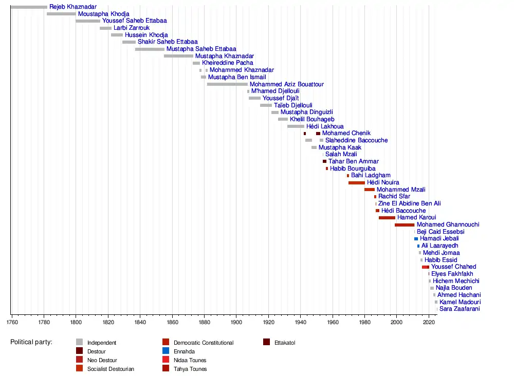 Mohammed Aziz Bouattour is considered the first indigenous Tunisian to hold the office in 1882. He is the longest-serving Prime Minister in the history of Tunisia with a period of nearly 25 years, and during his term, the French protectorate was established in Tunisia.
