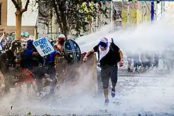 Primera Línea (lit. First line or Frontline) is the name for a loose collective of protesters dedicated to physically confronting Chilean riot police, that is, through acts of civil disobedience, in the context of the 2019–2022 Chilean protests. In the words of a member "it's about contesting [state] power".[1] The Primera Línea is made up of an assortment of individual citizens and grassroots organizations called "clans", lacking central authority.[1] A wide range of sympathetic organizations support Primera Línea providing them with aid, food and legal advice.[2][3] Members are of diverse backgrounds, including laborers, immigrants, university students and sports fans. In addition, 16 hooded minors identified as part of this strike force have been detained. They have subsequently been placed at the disposal of the National Service for Minors (Sename).[2][3]