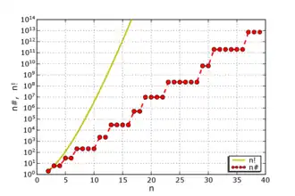 n! (yellow) as a function of n, compared to n#(red), both plotted logarithmically.