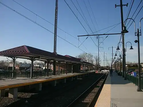 Primos station is a SEPTA Regional Rail station in the Primos area of Upper Darby Township, Pennsylvania. Located at Oak and Secane Avenues, it serves the Media/Wawa Line. In 2013, this station saw 322 boardings and 398 alightings on an average weekday.[3] It consists of a pre-fabricated office trailer on one platform, and an open brick shelter on the other, and includes a 52-car parking lot. Before becoming an established station, Primos was a flag stop known as Oak Lane.