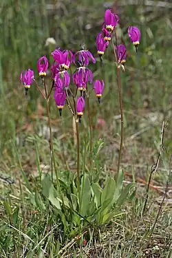 Primula poetica, synonym Dodecatheon poeticum,[2] is commonly known as the poet's shooting star or the narcissus shooting star. P. poetica is a species of the genus Primula placed in section Dodecatheon. It is native to the states of Oregon and Washington in western North America. The section contains herbaceous flowering plants and is also a part of the primrose family Primulaceae. This plant has basal clumps of leaves and drooping flowers that occur at the apex of tall stems that rise from where the leaves join.