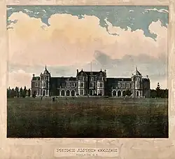 A lithograph of the completed main building with its wings.