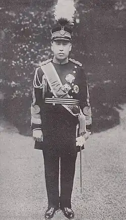 Prince Yi Kang was appointed special ambassador to the Empire of Japan for the celebration ceremonies for Japan's victory in the First Sino-Japanese War of 1894–1895.[8] Yun Chi-ho, who met Yi before going Europe, assessed him as a smart 18 years old who had a good personality like his father but whom worried to study abroad.[9] In August 1895, Yi was appointed as Special ambassador and visited some European countries including, the United Kingdom, Germany, France, Russia, Italy and Austria-Hungary.[8] In 1899, he in Japan. According to Japanese record, 3,000 Won was sent for Yi.[10] While he was not in Korea, Yi Kang was promoted to the rank of Prince Imperial Ui, and styled His Imperial Highness in 1900.[11] At the same year, he went to the United States and began studies at Roanoke College in Salem, Virginia from March 1901, where he majored in mathematics.[12] While he was in the United States, the Korean Government gave him 30,000 Won in 1902.[13] While in America, Yi was beaten by some Americans in 1903.[14] In 1904, some Korean foreign students tried to dethrone Gojong and make Yi the emperor.[15] After graduation, he spent a brief period at the Ohio Wesleyan University in Delaware, Ohio, and then traveled to San Francisco and Hawaii, returning to Korea on 15 March 1906.[12][16] Same year, he got Order of the Golden Ruler.[17] On 8 April 1906, Yi was appointed as Lieutenant General (부장).[18] He was appointed as Chanmogwan and was ordered to participate in the Military parade in Empire of Japan.[19] He received 1st class of Order of the Paulownia Flowers from the Japanese Government while he was in Japan.[20]