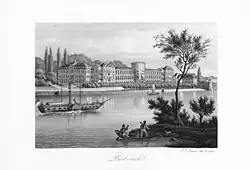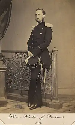 Prince Nikolaus was raised with his siblings in the ducal household in Nassau, and grew up between his parents' residences, the City Palace in the duchy's capital of Wiesbaden and Biebrich Palace, located on the banks of the Rhine River in Biebrich south of the city.[1] His father died in 1839 when he was six years old and was succeeded as the Duke of Nassau by his half-brother Adolf. In 1840, the young general staff officer Robert Roth was appointed his governor and thus supervisor of the prince's upbringing, a position which Roth held until 1849. After being educated at home in his childhood, he started a military career at the age of 12.[1] On 25 February 1845, he joined the 2nd Infantry Regiment of the Ducal Army of Nassau as a second lieutenant and became a first lieutenant there on 24 July 1849.[1] On 2 February 1850, he left the Nassau army and went into Austrian service as a lieutenant colonel in the 18th Jäger Battalion of the Imperial Austrian Army.[1] He remained in Austrian service until June 1854 when he reentered the Army of Nassau as a captain à la suite in the Jäger Battalion and became a major à la suite on 1 July 1855.[1] As such, he participated at the Austrian headquarters in the Italian War of 1859 against France and the Kingdom of Sardinia.[1] In 1856, he became a member of the Council of State of the Duchy of Nassau.[1]
