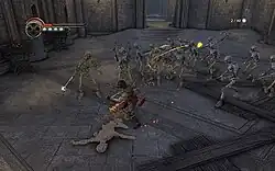 After a point in the game, the Prince gains access to different magical powers, the most basic of which is a limited-use "rewind" function which resets time if the player makes a mistake or the Prince takes damage.[4] The powers are themed around the elements; the "Water" powers allow the freezing of water flows to make walls and poles for navigation, the "Earth" power restores destroyed elements of the environment, while Wind and Fire powers are used in combat as offensive spells.[4][5] Combat has the Prince fighting groups of enemies, relying on dodging and rolling to avoid hits.[1][4][6] Killing enemies grants a form of experience points, which can be used to upgrade existing abilities and statistics such as health, and unlock new powers.[5] This version featured rewards unlocked with points through UPlay; these rewards included an experience point boosts and additional costumes based on both Prince of Persia characters and Ezio from the Assassin's Creed series.[7] UPlay support ended for 360 and PS3 in 2017, and for Windows in 2021, locking off UPlay content.[8]