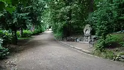 In 1870, a bust of the poet John Nicholson was erected in the park by public donation, but the bust went missing, with only the stone plinth remaining.[18] A drinking fountain, supplied by a temperance society, was installed in 1866.[19] By the end of the 19th century, two aqueducts (Nidd and Barden) were constructed underneath the west side of the park carrying water from reservoirs in the Yorkshire Dales to Chellow Heights water treatment works.[12]