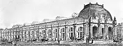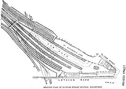 By 1870, with increasing traffic, it was decided to build a new station slightly further north, still on Lothian Road but nearer Princes Street.[2] Renamed Princes Street Station, it was opened in May 1870. It was built of timber with a pitched, slated roof. In June 1890, the building, which had been called the "wooden shanty", suffered a major blaze.