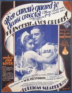 Princess, At Your Orders! (French: Princesse, à vos ordres!) is a 1931 German romantic comedy film directed by Hanns Schwarz and Max de Vaucorbeil and starring Lilian Harvey, Henri Garat, and Jean Mercanton.[1] It was produced by UFA as the French-language version of the studio's film Her Grace Commands. In the early years of sound films, before the practice of dubbing became widespread, it was common for a film to be reshot in multiple languages.