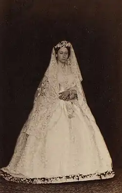 Between the engagement and the wedding, Alice's father Prince Albert died on 14 December 1861. Despite the Queen's grief, she ordered that the wedding should continue as planned. On 1 July 1862, Alice and Louis were married privately in the dining room of Osborne House, which was converted into a temporary chapel. The Queen was ushered in by her four sons, acting as a living screen blocking her from view, and took her place in an armchair near the altar. Alice was given away by her uncle, Albert's brother Ernest II, Duke of Saxe-Coburg and Gotha, and was flanked by four bridesmaids: her younger sisters, Princesses Helena, Louise and Beatrice, as well as Louis's sister Princess Anna. For the ceremony, Alice wore a simple white dress, with a veil of Honiton lace and a wreath of orange blossom and myrtle, but was required to wear black mourning clothes before and after the ceremony. The Queen, sitting in an armchair, struggled to hold back her tears, and was shielded from view by the Prince of Wales and Prince Alfred, her second son, who cried throughout the service. The weather at Osborne was dreary, with winds blowing up from the Channel.[28] The Queen wrote to her eldest daughter, Victoria, that the ceremony was "more of a funeral than a wedding", and remarked to Alfred, Lord Tennyson that it was "the saddest day I can remember".[29] The ceremony—described by Gerard Noel as "the saddest royal wedding in modern times"[30]—was over by 4 pm, and the couple set off for their honeymoon at St Claire in Ryde, a house lent to them by the Vernon Harcourt family. Alice's entourage consisted of Lady Churchill, General Seymour and Baron Westerweller (a Hessian courtier).[30] Alice was careful not to displease the Queen after her marriage. When the Queen visited the couple at St Claire, Alice tried not to appear "too happy". Despite this, Alice's displays of romantic bliss made the Queen jealous of her daughter's happiness.[31]