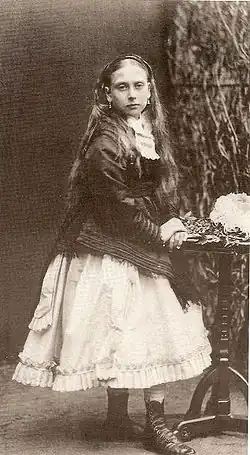 From birth, Beatrice became a favoured child.[6] The elder favourite daughter of Prince Albert, the Princess Royal, was about to take up residence in Germany with her new husband, Frederick ("Fritz") of Prussia. At the same time, the newly arrived Beatrice showed promise. Albert wrote to Augusta, Fritz's mother, that "Baby practises her scales like a good prima donna before a performance and has a good voice!"[7] Although Queen Victoria was known to dislike most babies, she liked Beatrice, whom she considered attractive. This provided Beatrice with an advantage over her elder siblings. Queen Victoria once remarked that Beatrice was "a pretty, plump and flourishing child ... with fine large blue eyes, [a] pretty little mouth and very fine skin".[8] Her long, golden hair was the focus of paintings commissioned by Queen Victoria, who enjoyed giving Beatrice her bath, in marked contrast to her bathing preferences for her other children. Beatrice showed intelligence, which further endeared her to the Prince Consort, who was amused by her childhood precociousness.[6]