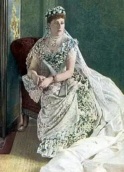 The beauty of Beatrice's daughter, Ena, was known throughout Europe, and, despite her low rank, she was a desirable bride.[60] Her chosen suitor was Alfonso XIII of Spain. However, the marriage caused controversy in Britain, since it required Ena to convert to Catholicism.[61] This step was opposed by Beatrice's brother, Edward VII, and Spanish ultra-conservatives were against the King's marriage to a Protestant of low birth, as her father, Prince Henry, was the son of a morganatic marriage. Thus, they considered Ena to be only partly royal and thus unfit to be Queen of Spain.[60] Nonetheless, the couple wed on 31 May 1906. The marriage began inauspiciously when an anarchist attempted to bomb them on their wedding day.[60] Apparently close at first, the couple grew apart. Ena became unpopular in Spain and grew more so when it was discovered that her son, the heir-apparent to the throne, suffered from haemophilia. Alfonso held Beatrice responsible[62] for having brought the disease to the Spanish royal house and turned bitterly against Ena.[62]