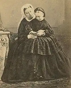 In March 1861, Queen Victoria's mother Victoria, Duchess of Kent, died at Frogmore. The Queen broke down in grief and guilt over their estrangement at the beginning of her reign.[10] Beatrice tried to console her mother by reminding her that the Duchess of Kent was "in heaven, but Beatrice hopes she will return".[11] This comfort was significant because Queen Victoria had isolated herself from her children except the eldest unmarried daughter, Princess Alice, and Beatrice.[12] Queen Victoria again relied on Beatrice and Alice after the death of Albert, of typhoid fever, on 14 December.[13]
