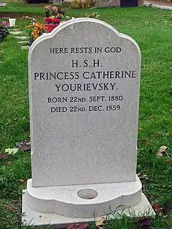 - ^ From a newspaper report quoted by Tarsaïdzé in Katia: wife before God (1970), at p. 311: "Russian Princess Laid to Rest at Hayling: A simple, but very unusual, funeral took place at the little church of St. Peter, North Hayling, on Tuesday. An 84-year-old [sic] Russian princess, Catherine Yourievsky, whose father, Alexander II, had been assassinated, and who had walked for miles without food during the Revolution, suffering great hardship, was laid to rest..."