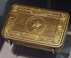 The funding was used to manufacture small boxes made of brass; however, due to metal shortages in the later stages of the war some tins were made from plated base metals or alloys.[6] Each tin was decorated with an image of Mary and other military and imperial symbols along with the names of the UK's then allies.[5] The Princess’s “M” monograph appears to either side of her portrait.[7] The design was by Stanley Adshead and Stanley Ramsey.[5] The words "Christmas 1914" appear on a plaque in the bottom centre of the box with space left above them to allow the owner to carve their name.[8]