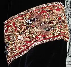 The backstories of the cultures depicted in the films had to be shown through subliminal glimpses on screen, while for the Elves and Gondorians, fictional histories were presented by changing styles of armour. The Elves have an Art Nouveau influence that involves leaves and flowers, while the Dwarves have a preoccupation with geometry intended to remind the audience of their digging nature.[27] The Hobbits hark back to 18th-century England, the Rohirrim feature horse and sun motifs with visual inspiration from Beowulf and the Anglo-Saxon artifacts found in the Sutton Hoo burial ship, and the Gondorians reflect 16th-century German and Italian armour and the motif of the White Tree. The evil Haradrim Men take influence from Aztecs and Kiribati after bad feedback from Phillipa Boyens over looking African. Most of the Orc armour is sharp, reflecting secateurs, and is written with runes to reflect worship of Sauron.[37]