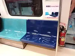 Priority seats are train seats that have been designated in public transport vehicles by certain transport operators to allow elderly, disabled, pregnant women and the injured to ride public transport with an equal degree of access and comfort as other people. Priority seats can be found on various public transportation, including the mass transit railways, buses, minibuses, and trams. The slogan "Please offer your seat to anyone in need" is often displayed beside the seat. The elderly, disabled, pregnant, and injured have priority to take these seats. In most cases, there is no regulation[1] to restrict the use of priority seats, but people are expected to offer their seats to those in need.