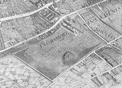 The building was converted to prison at the time of the Reign of Terror in 1793, then a women's prison in the early 19th century, its land having been seized and re-allotted little by little since the Revolution. It was largely demolished in 1935, with the Assistance publique - Hôpitaux de Paris installing itself in the remaining buildings, where they remained until recently. Only the prison infirmary and chapel (built by Louis-Pierre Baltard in 1834) remain of the prison, with the latter to be seen in the square Alban-Satragne (107, rue du Faubourg-Saint-Denis) in the 10th arrondissement. The surviving remains of the Saint-Lazare prison were inscribed on the supplementary inventory of historic monuments in November 2005.[1]