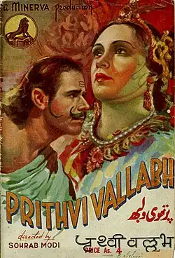 Prithvi Vallabh (Hindi: पृथ्वी वल्लभ) is a historical drama Bollywood film directed by Sohrab Modi. Made under the Minerva Movietone banner it was released in 1943.[2][3] It had music by Rafiq Ghaznavi and Saraswati Devi with lyrics by Pandit Sudershan who also wrote the screenplay and dialogues.[4] The film starred Sohrab Modi, Durga Khote, Sankatha Prasad, Kajjanbai, Meena Shorey, Sadiq Ali, K. N. Singh and Al Nasir.[5]