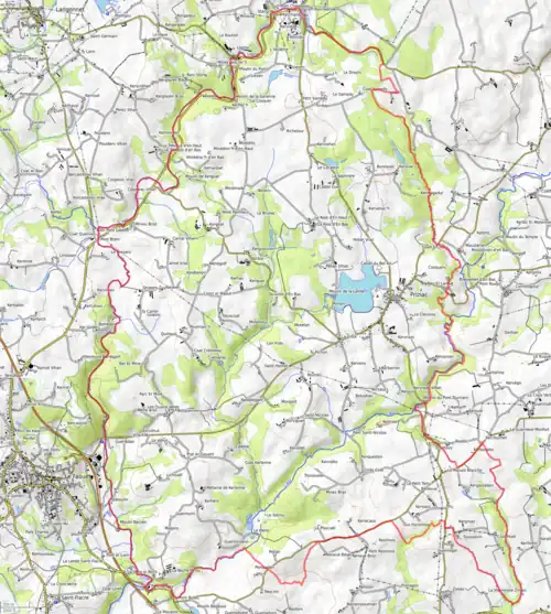 Priziac is border by Le Faouët and Langonnet to the west, by Plouray to he north, by Meslan to the south, Saint-Tugdual and Le Croisty to the east.