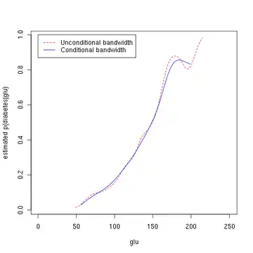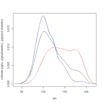 In this example, we construct three density estimates for "glu" (plasma glucose concentration), one conditional on the presence of diabetes, the second conditional on the absence of diabetes, and the third not conditional on diabetes. The conditional density estimates are then used to construct the probability of diabetes conditional on "glu".