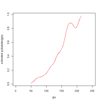 The second figure shows the estimated posterior probability p(diabetes=1 | glu). From these data, it appears that an increased level of "glu" is associated with diabetes.