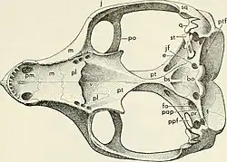 The snout of Probainognathus extended beyond the premaxillary processes, and was very thin. The apparent fragility of this structure has led to it being broken off several specimens, and has led to an increased difficulty in studying it.[1] There are several features that have been identified, however. The suborbital arch and the zygomatic arch were both shaped relatively sharply, and there was an extension of the squamosal posteriorly on the zygomatic arch. Probainognathus had a long secondary palate as it stretched all the way to the posterior end of the tooth row.[1] The secondary palate was formed largely by the palatine, and it was somewhat narrow. This narrowing of the palate allowed for the conservation of space to be able to fit the back, lower postcanine teeth. Moreover, the vomer stretched posteriorly to the secondary palate, and significant pterygoid flanges were present, as well.[1]
