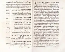 Prodromus sought to connect Coptic with many different languages—Arabic, Classical Armenian, Geʽez, Samaritan Hebrew, and Syriac. While this was a challenge both to conceive and to print, the frequent mistakes in Kircher's Arabic suggest that many of the connections he claimed to find were of questionable reliability. With Coptic texts, he did not translate them, but merely placed them side by side—often inaccurately—with their equivalent passages from the Vulgate.[5]: 209