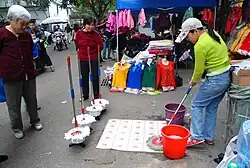 A wide variety of products are demonstrated roadside throughout the China. Such products include frying pans, induction cookers, rubber gloves, vegetable peelers and slicers, stain removers, and knives.