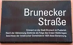 Toponymy played a major part in Tolomei's struggle right from the beginning. In the articles he wrote for The Italian Nation he already used Italianized names, although these early attempts lacked the method and purpose of his later activities. In those days he would use the name Alto Trentino for South Tyrol, not having yet come upon and revived the Napoleonic creation Alto Adige, which would become the official Italian designation for the province after World War I and up to this day. Likewise, he used to call the Brenner Pass "Pirene", which in his later publications would become "Brennero".[2] His work became more systematical with the founding of the Archivio per l' Alto Adige, through which he began to propose Italianized names for villages and geographical features in South Tyrol. In 1916, a year after Italy, instigated by Allied promises and its own nationalist tendencies, entered the First World War, a commission was set up to find Italian names for places in the "soon to be conquered territory". The commission (composed of Tolomei himself, the Professor of Botany and Chemistry Ettore De Toni as well as the librarian Vittorio Baroncelli) reported almost 12,000 Italian place and district names on the basis of Tolomei's studies. In June 1916, this list was published as Volume XV, Part II of Memorie of the Reale Società Geografica Italiana as well as in the Archivio per l'Alto Adige.[3]