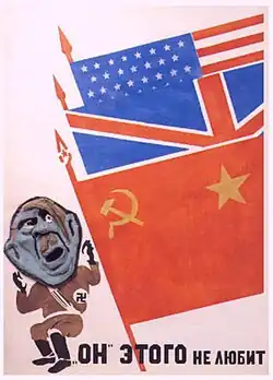 At the start of WWII, the Molotov–Ribbentrop Pact, a non-aggression pact between the Soviet Union and Nazi Germany, was signed.[29] It lasted up until 22 June 1941, when Germany invaded the Soviet Union by surprise in Operation Barbarossa.[29] During that period, nationalism dominated Soviet propaganda. Ewe M Thompson highlights the press as a primary medium by which nationalist propaganda functioned within the Soviet Union.[30] In 1939, during the Soviet invasion of Poland, the Soviet press continued to vilify Poland and its people.[31] Soviet newspapers "encouraged hatred" from the states of the union by presenting Poland as having "brutalised millions of Belarussians, Ukrainians, and Jews".[31] The press glorified the liberation of the country from "Polish overlords".[32] It also endorsed Hitler's resentments of the Poles, and introduced Soviet schools containing Russian textbooks aimed "to increase the use of Russian among the non-Russian population".[33] The effect of Soviet propaganda promoted the "Russification" in Soviet states.[33]