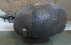The dorsal armor was made up of transversal plaques files but were still present, along the lateral and front margins, two or three rows of osteoderms that indicate slight flexibility. The ornamentation of the plates consisted in a large central -oval figure, surrounded by a row of polygonal peripheral figures. The carapace was short and convex, with 19–20 transverse osteoderms on the midline, which became 27 on the side edges due to two bifurcations. The plates are equipped with clear but shallow furrows, and the central figures are generally flat, even if slightly swollen in the back. Small hair piles were present, located in the points of origin of the radial furrows. The tail was protected by five or six mobile rings, followed by a solid bone tube, probably corresponding to four rings welded together; the tube stopped abruptly, and was closed posteriorly by an irregular plate.