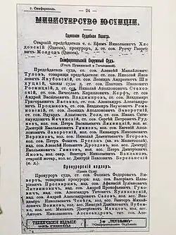 The District Court of Simferopol consisted of the Head, the Deputies and the Members also under the governance of the Court there were the Prosecutor, the Detective and the Notary. According to the Court regulations, the Prosecutor was the accusatorial body of the State and at the same time, the supervision was also executed by the Prosecutor. At the Public Record Office, there are notes about the following prosecutors of the District Court of Simferopol from its establishment till the abolition in 1920. They were: Boris Vitte, Mykola Domchynskii, Novytskii, Felix Zivert, Umanskii. There are also evidences that under the supervision of the Prosecutor Felix Zivert there were nearly eleven prosecution attorneys.
