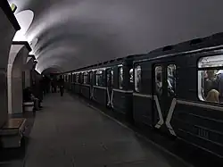 Prospekt Mira (Russian: Проспект Мира) is a station on the Kaluzhsko–Rizhskaya line of the Moscow Metro. It was designed by V. Lebedev and P. Shteller and opened on 1 May 1958. The station features flared pylons faced with white marble and trimmed with sharp-edged metal cornices. The walls are faced with off-white ceramic tile with horizontal black stripes.