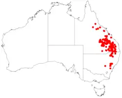 This mint bush grows in forest, often in rocky places and is found from the Leichhardt region of north Queensland to northern New South Wales.[2][9] Wollemi mint-bush has a restricted distribution between the Lithgow and Sandy Hollow districts of New South Wales. Populations of subsp. cryptandroides occur within the Wollemi and Gardens of Stone National Parks.[10]