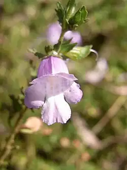 Prostanthera cryptandroides is a low, spreading, strongly aromatic shrub, the branches with spreading hairs as well as glandular hairs. The leaves are pale green, narrow egg-shaped, 6–9 mm (0.24–0.35 in) long, 2–3 mm (0.079–0.118 in) wide and sessile or on a petiole up to 1 mm (0.039 in) long. The flowers are tube-shaped and arranged in upper leaf axils near the ends of branchlets. There are bracteoles 4–5 mm (0.16–0.20 in) long at the base of the flower, but that fall off as the flower develops. The sepals are 6–7 mm (0.24–0.28 in) long and form a tube 3–4 mm (0.12–0.16 in) long with two lobes, the upper 3–4 mm (0.12–0.16 in) long. The petals are lilac to mauve and 11–15 mm (0.43–0.59 in) long. Flowering occurs from September to April.[2][3]