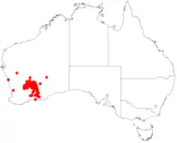 This mintbush grows on granite outcrops and ridges and on stony hills and undulating plains in the Avon Wheatbelt, Coolgardie, Mallee and Murchison biographic regions of Western Australia.[2][3]