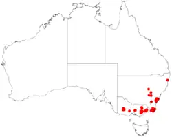 Hairy mintbush grows on elevated, rocky sites in woodland and open forest in New South Wales from the Blue Mountains to the Budawang Range and in southern Victoria.[2][3]