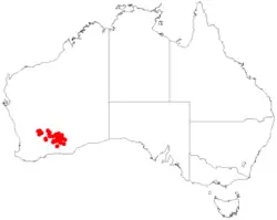 This mintbush sometimes grows in low woodland, and has been collected in the Avon Wheatbelt, Coolgardie and Mallee biogeographic regions.[2][3]