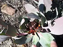 The blooms are produced at the ends of the erect branches in the winter,[5] mostly in May to July, sometimes extending to September.[6] As the inflorescence begins to bud, the surrounding leaves on the stem below it grow to curve over and around the flower head, enfolding it like those of a cabbage, so as to completely hide it from view.[14] The flowers, or more specifically the nectar, exude an odd, not unpleasant, yeasty odour, with a sweetish scent superimposed.[15]