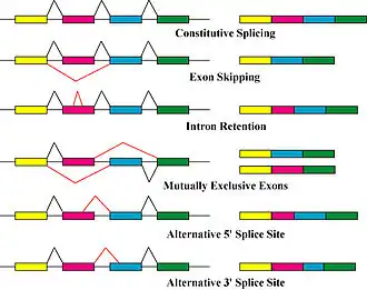 - ^ Lee Y, Rio DC (2015-01-01). "Mechanisms and Regulation of Alternative Pre-mRNA Splicing". Annual Review of Biochemistry. 84 (1): 291–323. doi:10.1146/annurev-biochem-060614-034316. PMC 4526142. PMID 25784052.