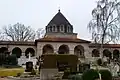 The Evangelical Protestant Central Cemetery in Regensburg was inaugurated on November 2, 1898. It blends the elements of a rural cemetery in a landscaped park-like setting with a monumental Christian cemetery character. The new central cemetery was the successor to two older non-existent Protestant cemeteries, namely the Lazarus cemetery and St. Peter's cemetery, which were both located near the city wall. To establish a new cemetery catering to all Protestant parishes of Regensburg, the Evangelical Lutheran deanery set up a commission that included Julius Pöverlein and Christian Zinstag as architects and appointed Conrad Mayer as a landscape designer. Some additional requirements from the city had to be taken into account, because part of the cemetery land was to be used as a communal municipal cemetery under the control of the city administration in order to bury the non-religious citizens without any church affiliation and serve as a potter's field for found unidentified decedent as well as suicide burials. The mortuary and a prayer hall were built in the Neo-Renaissance style in 1898. Access to the cemetery is from the north via a three-arched portal designed by German Bestelmeyer, with the Biblical inscription “Your dead shall live” (Isaiah 26:19) above the central arch, topped by a large stone cross. The cemetery was consecrated on November 2, 1898 by Rudolf Woldemar Koch, the Lutheran provost General-Superintendent, and the first burial recorded on the cemetery grounds was Luise Hirschmann, the wife of the stonemason Gottfried Hirschmann, who was also involved in the design of the cemetery. In mid-July 1899, an approximately 10 meters long gigantic crucifix was placed on the cemetery ground which was created by the sculptor Anton Hess. The cemetery houses many ornate mausoleums and family chapels, including the impressive Dörnberg mausoleum, built between 1911 and 1914. The mausoleum is characterized by an exterior staircase flanked by resting lions and a high, steep-arched stone dome with shell limestone cladding based on the Byzantine architecture. Above the portal is the coat of arms of the Von Dörnberg family. In the interior, vaulted by a flat dome painted in Art Nouveau style, is the circular crypt with eight burial chambers. The room is decorated with mosaics and a large Caritas figure, as well as a bust of Ernst von Dörnberg.[1][2][3]