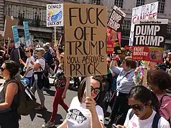 Protests against Donald Trump have occurred in the United States and internationally, even before his entry into the 2016 presidential campaign. Protests have expressed opposition to Trump's campaign rhetoric, his electoral win, his first inauguration, his alleged history of sexual misconduct and various presidential actions, most notably his travel ban in 2017 and aggressive family separation policy in 2018.[12][13] Some protests have taken the form of walk-outs, business closures, and petitions as well as rallies, demonstrations, and marches. While most protests have been peaceful,[14] actionable conduct such as vandalism and assaults on Trump supporters has occurred.[15][16] Some protesters have been criminally charged with rioting.[17] The largest organized protest against Trump was the day after his first inauguration; millions protested on January 21, 2017, during the Women's March, with each individual city's protest taken into consideration, makes it the largest single-day protest in the history of the United States.[18] Following Trump's victory in the 2024 presidential election, a new wave of protests was held in reaction to his second presidency.[19]