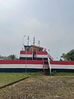 After several unsuccessful attempts at colonization along the Pepper Coast,[3][4][5] the American Colonization Society sent two agents, Robert F. Stockton and Eli Ayers, to negotiate with local chieftains to secure a place for colonization.[2][6] A conference was held at Cape Mesurado, which the locals called Ducor. Reaching an agreement, known as the Ducor Contract, the Society acquired the land bounded on the north and west by the Atlantic Ocean and on the south and east by the Mesurado River, including Cape Mesurado and land on Dozoa Island in the bay.[2][7][Notes 1] To ensure the validity of the purchase,[Notes 2] Ayers and Stockton ensured that all the surrounding chiefs signed the document.[2] It was executed by Gola chiefs Kaanda Njola of Sao's Town and Long Peter of Klay; Dei chief Kai-Peter of Stockton Creek; Kru chief Bah Gwogro (also George) of Old Kru Town; and chief Jimmy from St. Paul River.[11]
