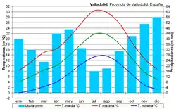 The Continental Mediterranean climate is typical of Meseta Central, which is located in the province of Valladolid. It is similar to the typical Mediterranean but with characteristics of continental climates, of more extreme temperatures, although it does not go to be as different as to be classified separately. In addition this climate does not receive the influence of the sea, that is why the temperatures are the most extreme of Spain, with a lot of heat summers and winters quite cold with a swing of 18.5 . According to the Köppen climate classification, the main climate in the province in the 1981-2010 reference period is of type Csa (Hot-summer Mediterranean climate) and type Csb (Warm-summer Mediterranean climate).[6]