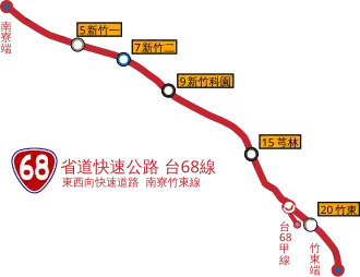 Provincial Highway 68 (Chinese: 台68線) is an expressway, which begins in Hsinchu City at Nanliao on the Provincial Highway No. 15 and ends in Zhudong on Zhongfeng Road (Provincial Road No. 3).