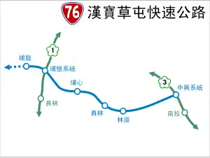 Provincial Highway 76 (Chinese: 台76線) is an expressway, which begins in the border of Puyan, Changhua and Fuxing, Changhua on Jhangshuei Road (Provincial Highway 19) and ends in Caotun, Nantou on (National Highway No. 3).
