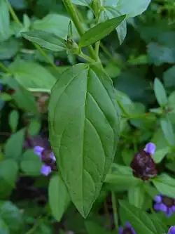 The leaves are lance-shaped, serrated and reddish at the tip, about 2.5 cm (0.98 in) long and 1.5 cm (0.59 in) broad, and growing in opposite pairs down the square stem.[9] Each leaf has 3-7 veins that shoot off the middle vein to the margin. The stalks of the leaves are generally short, but can be up to 5 cm (2.0 in) long.[10]